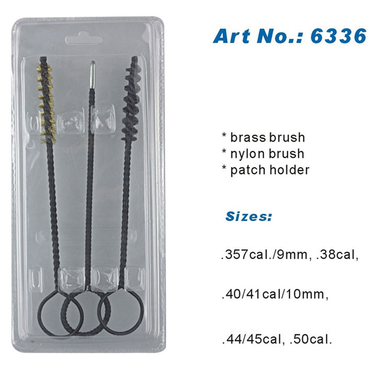 Kit de limpeza de pistola de 9 mm embalado em blister ● Tamanhos disponíveis:9mm.10mm..45cal.. ● Escovas resistentes e suporte de remendo com fenda, bons para limpeza de furos. ● Embalagem blister duplo. ● Toda a arte 3PCS torcida com aço galvanizado de boa qualidade com anéis grandes. ● Fácil de colocar o logotipo e o logotipo do OEM ou do cliente