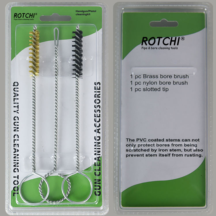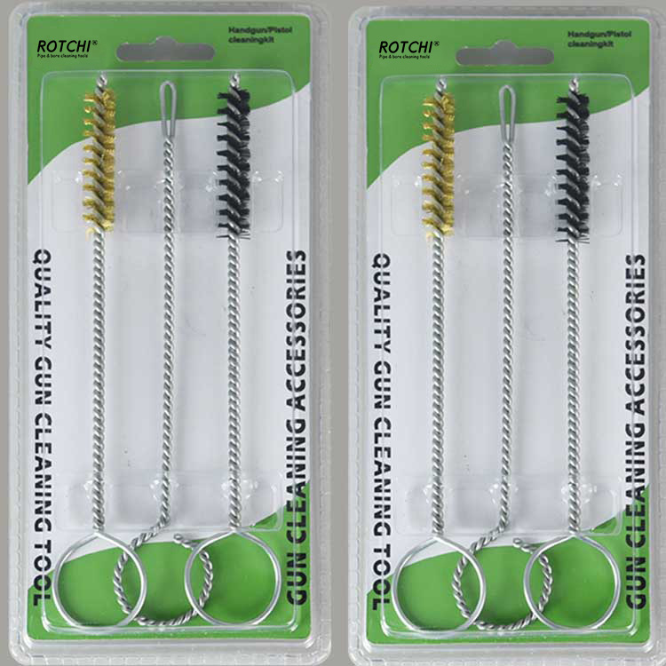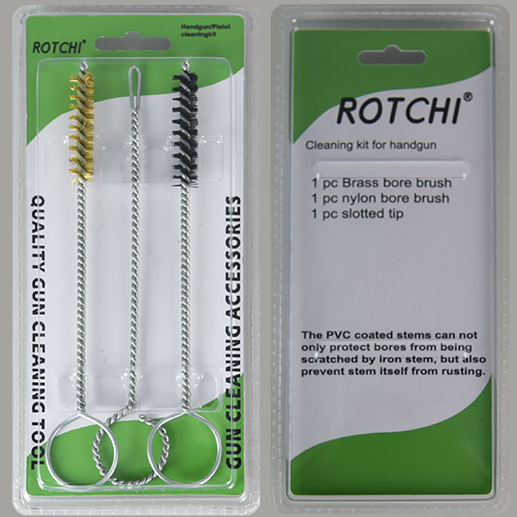 Pacote blister de kit de limpeza de pistola de 9 mm Kit de limpeza de arma de mão de 3 peças, embalado em blister duplo. Uma escova de limpeza de furo de latão, uma escova de limpeza de furo de náilon e um suporte de remendo com fenda. Prático e eficaz.