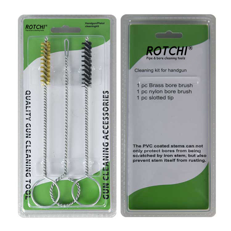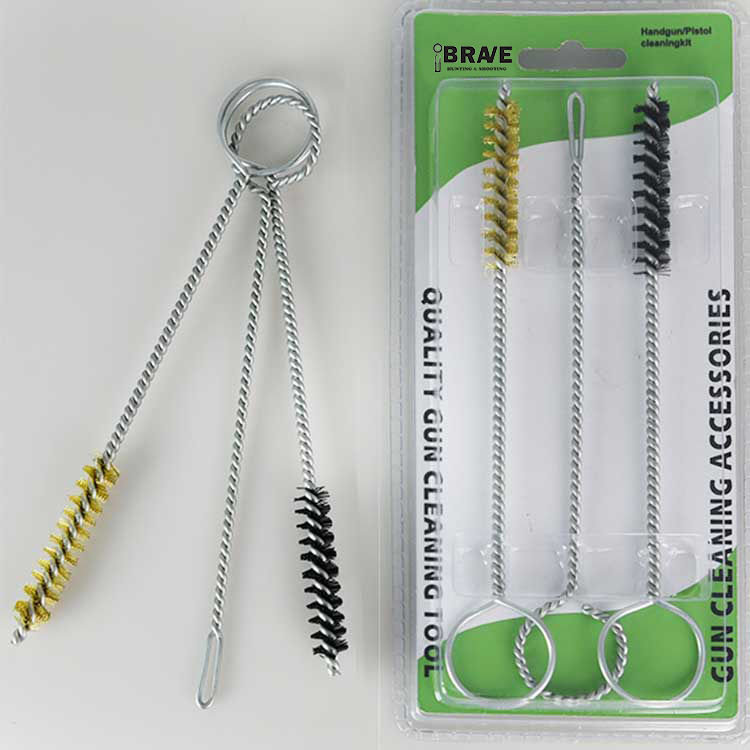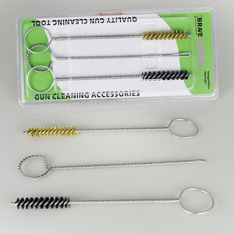 Kit de limpeza de arma de mão de 3 peças, embalado em blister duplo. Uma escova de limpeza de furo de latão, uma escova de limpeza de furo de náilon e um suporte de remendo com fenda. Prático e eficaz.