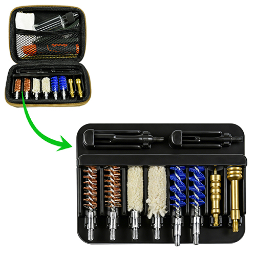 O kit de limpeza de pistola inclui 2 tamanhos (9 mm e 0,45 cal.). Pano de boi revestido Estojo de PVC com zíper. Escovas de latão, esfregões de algodão, escovas de náilon, entalhes de latão, 2 hastes. Areias e cor preta para escolhas.