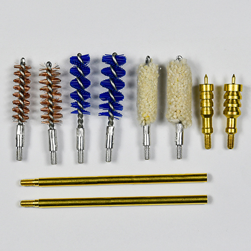 O kit de limpeza de pistola inclui 2 tamanhos (9 mm e 0,45 cal.). Pano de boi revestido