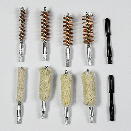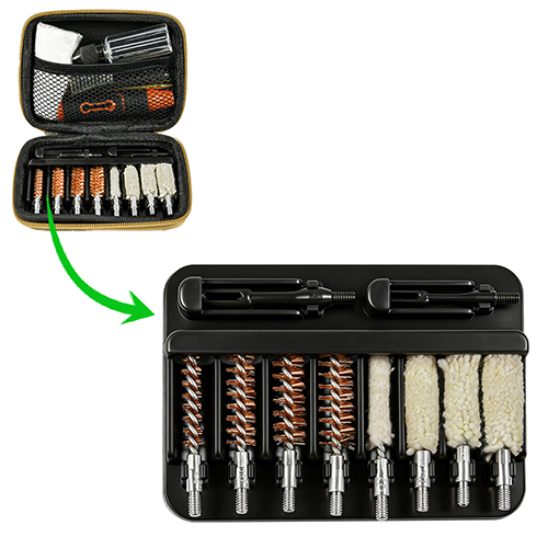 O kit de limpeza de pistola inclui 4 tamanhos (0,22, 9 mm, 0,40, 0,45 cal.). Pano de boi revestido Estojo de PVC com zíper. Escovas de latão e esfregões de algodão, 2 hastes. Areias e preto cor para escolhas.