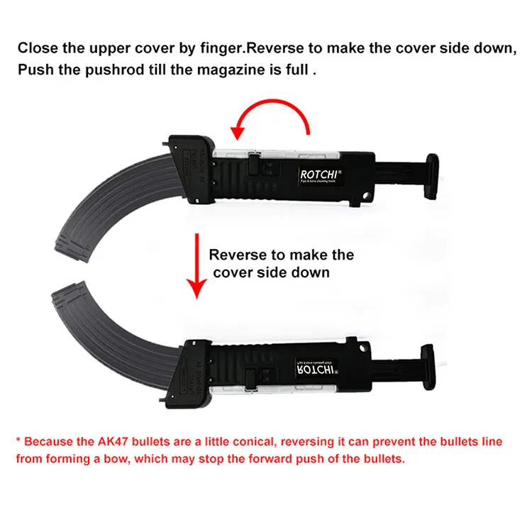 ● Encha os cartuchos completamente na ranhura, instale o carregador seguindo o mesmo princípio mecânico do AK. empurre o empurrador, os cartuchos entrarão facilmente no carregador.