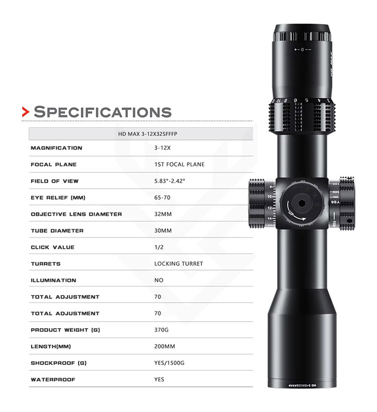 MAX 3-12X32SF FFP HD Lente Alta Caça Telescópio Monocular Atacado