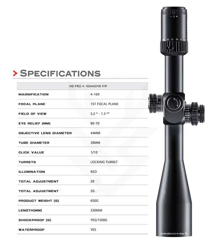 Óptica hd pro 4-16x44 sfir ffp alta resistência ao choque escopo de caça tático tiro de longo alcance tubo de 30mm