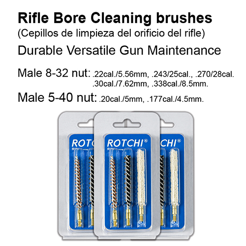 Conjunto 3 em 1 de escova para limpeza de cano de rifle, blister e embalagem de cartão. Tamanhos disponíveis: 0,177, 0,22, 0,25, 0,27, 0,30, 0,338 cal.