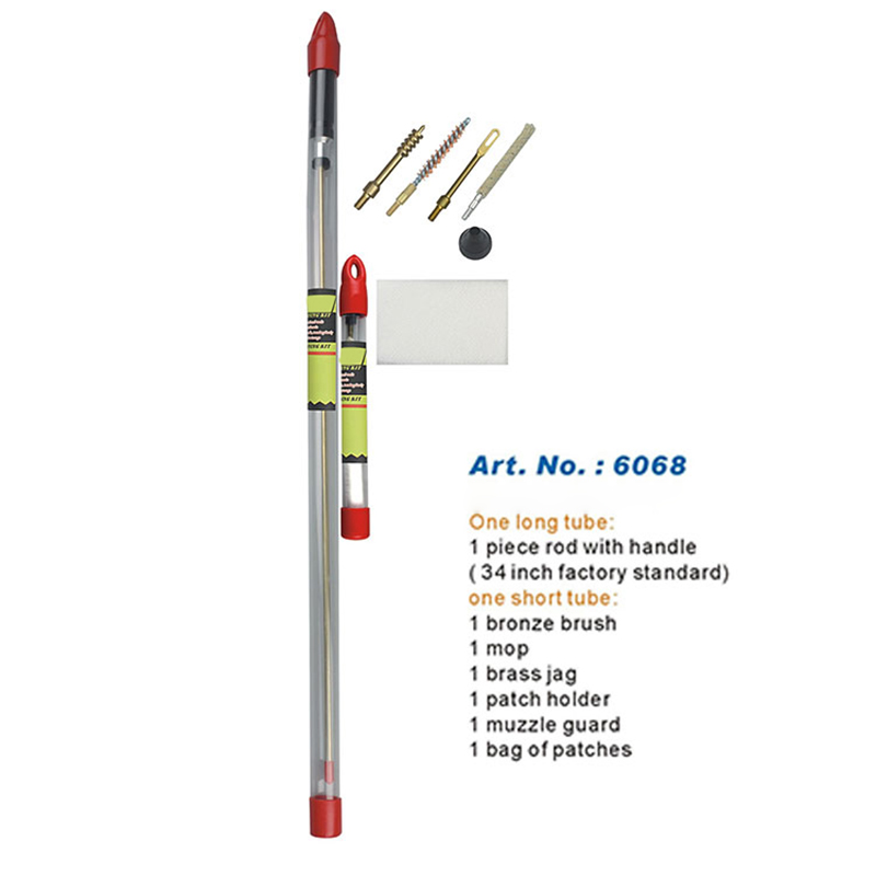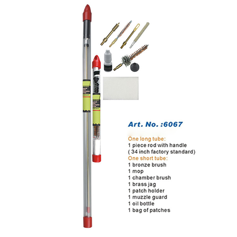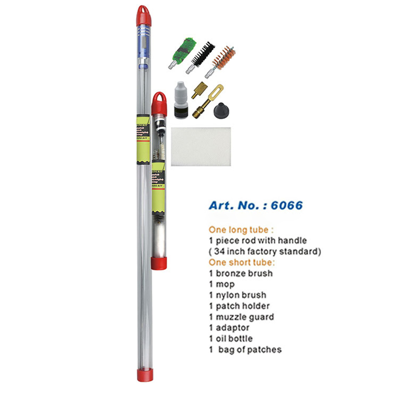 Kit de limpeza de rifle Pacote de tubo suspenso de haste longa de uma peça ● Haste longa de uma peça de 34 polegadas/860 mm, sem corte, sem pisar na haste. ● Escovas e acessórios de alta resistência, bons para limpeza de furos. ● A alça giratória de alumínio funciona livremente ● Embalado em tubo longo e transparente, para transportar e guardar facilmente. ● Fácil de colocar o logotipo e o logotipo do OEM ou do cliente